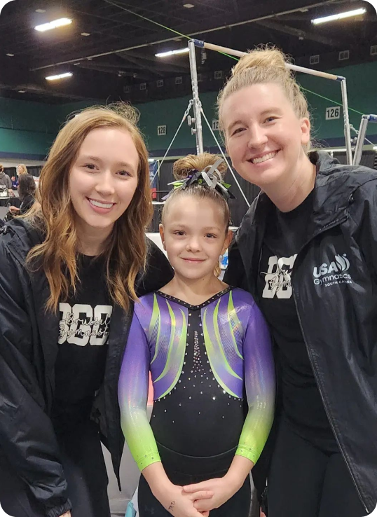COMPULSORY PROGRAM (USAG LEVELS 1, 2, 4 & 5) focus on building strong fundamentals in gymnastics, including strength, flexibility, coordination, and confidence. Athletes progress through skill-based levels as they master proper technique, body control, and basic routines on all events, creating a solid foundation for long-term success in the sport. Gymnasts compete the same routine on all events with steady skill progression for USAG Levels 6-10.